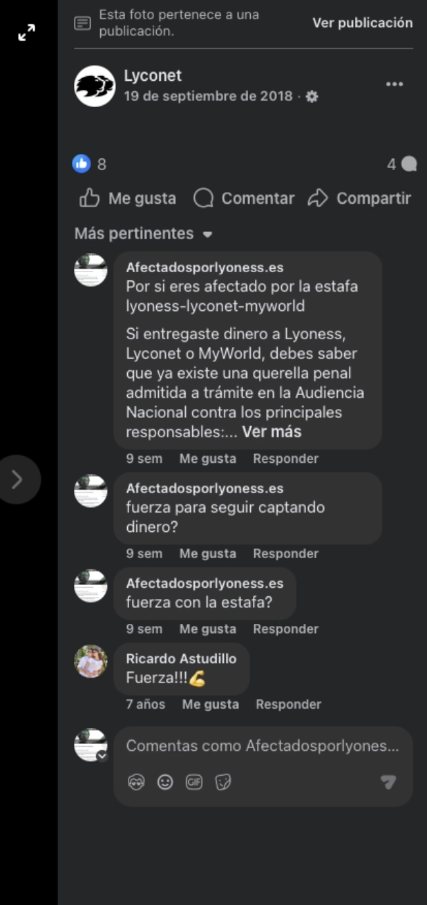 La organización ha tratado de mostrarnos como independientes a cada una de ellas, diciendo que myworld tiene un acuerdo para la comercialización con lyconet, cuando en realidad todo es lo mismo y tienen el mismo objetivo, hacer suyo nuestro dinero sin ofrecer absolutamente nada a cambio.