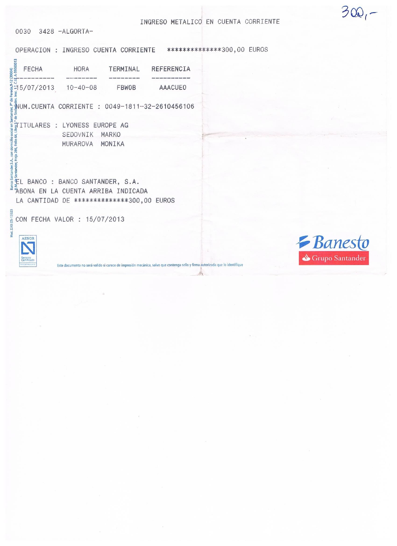 La famosa cuenta bancaria del banco Santander con nº 0049 1811 32 2610456106, Giuliana G. nos informa de la titularidad parcial de la misma, no indicando que detrás están Monica M. y Marko S.
